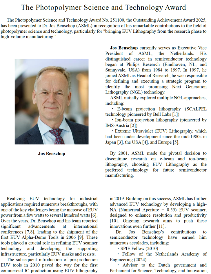 in recognition of his remarkable contributions to the field of photopolymer science and technology, particularly for "bringing EUV Lithography from the research phase to high-volume manufacturing."